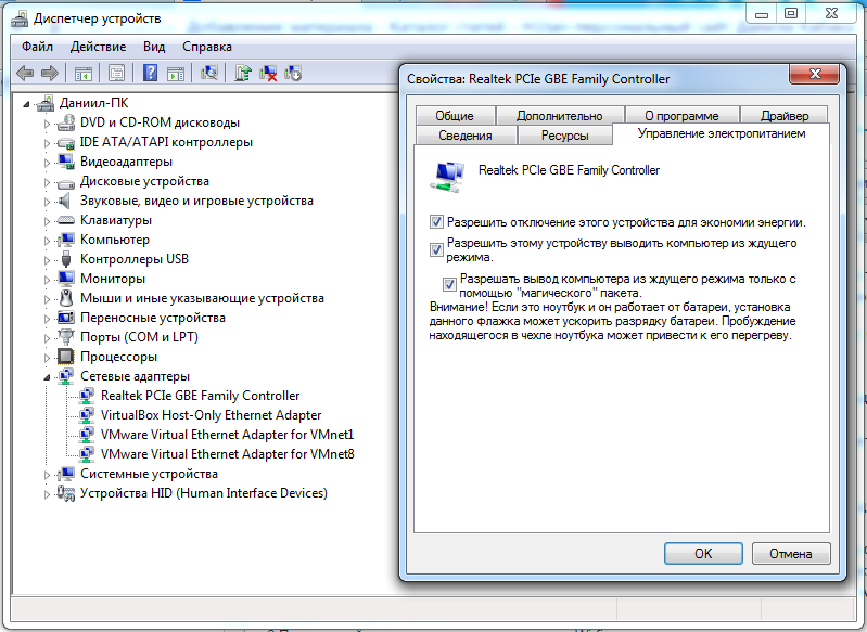 3.Узнайте свой локальный ip адрес и маску сети (MAC), разрешите вывод компьютера из спящего режима (Панель управления - Диспетчер устройств - Сетевые адаптеры - чаще всего адаптер "Realtek" - правой кнопкой по нему - Свойства - Управление электропитание - установите три галочки. (скрин)